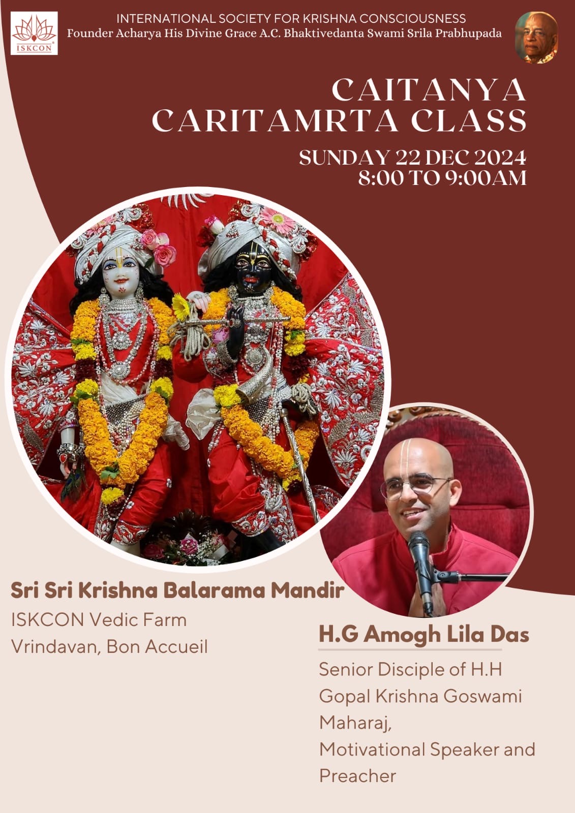 Please join us tomorrow at Sri Sri Krishna Balaram Mandir from 8 a.m to 9 a.m on 22 December 2024 for Śrī Caitanya-caritāmṛta class by HG Amogh Lila Prabhu (motivational speaker & preacher and Senior disciple of HH Gopal Krishna Goswami). Hare Krishna. Thank you.