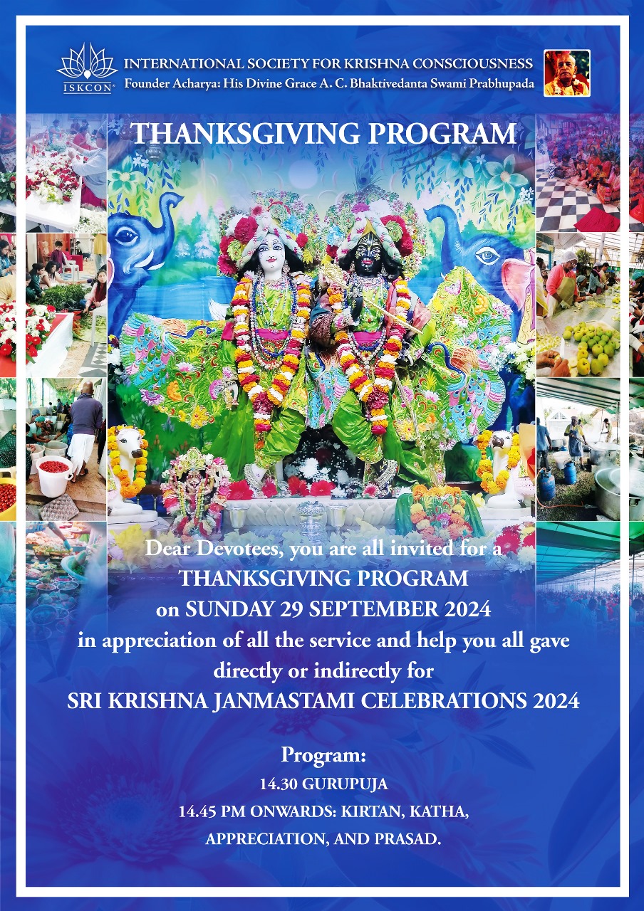 Sri Sri Krishna Balaram Mandir cordially invites you to a Thanksgiving Program on Sunday 29 September 2024 in appreciation of all the service and help you gave directly or indirectly for Sri Krishna Janmashtami celebrations 2024.